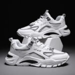These trendy chunky sneakers feature a clean white base accented with subtle gray details, creating a sleek and modern urban look. The upper is crafted from premium breathable mesh and synthetic leather, ensuring durability and ventilation for long-lasting comfort. The thick rubber outsole offers excellent anti-slip and cushioning performance, providing stability and ease of movement in any situation. Perfect for daily commutes, casual wear, or street-style looks, these sneakers effortlessly complement any outfit, showcasing your fashion sense.