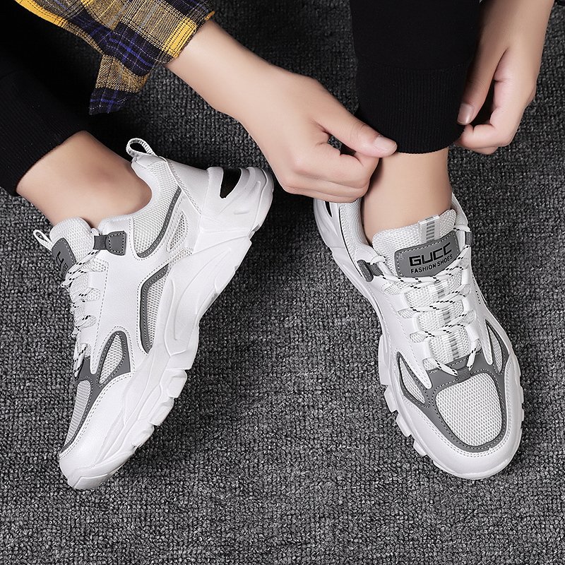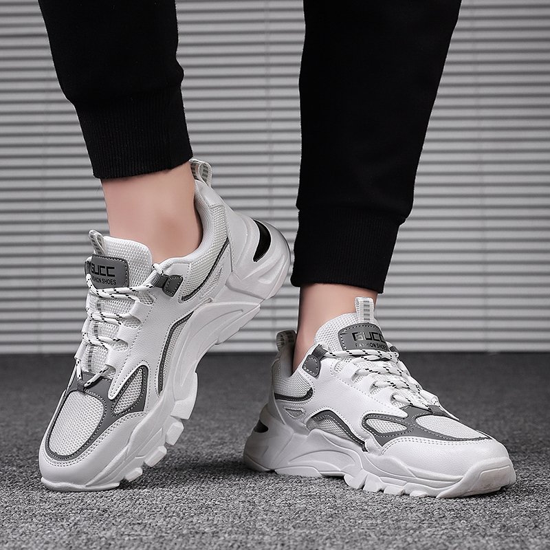 These trendy chunky sneakers feature a clean white base accented with subtle gray details, creating a sleek and modern urban look. The upper is crafted from premium breathable mesh and synthetic leather, ensuring durability and ventilation for long-lasting comfort. The thick rubber outsole offers excellent anti-slip and cushioning performance, providing stability and ease of movement in any situation. Perfect for daily commutes, casual wear, or street-style looks, these sneakers effortlessly complement any outfit, showcasing your fashion sense.