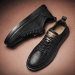 These all-black leather casual shoes are designed with simplicity and elegance, making them ideal for daily commutes, casual wear, or semi-formal occasions. The upper is crafted from high-quality synthetic leather, offering a refined texture and durability. The low-cut design ensures easy wearability and enhances overall comfort. The lightweight, high-elastic sole provides excellent cushioning and grip, making every step stable and effortless.