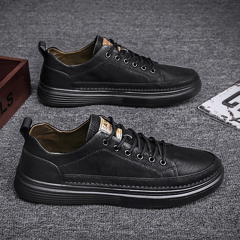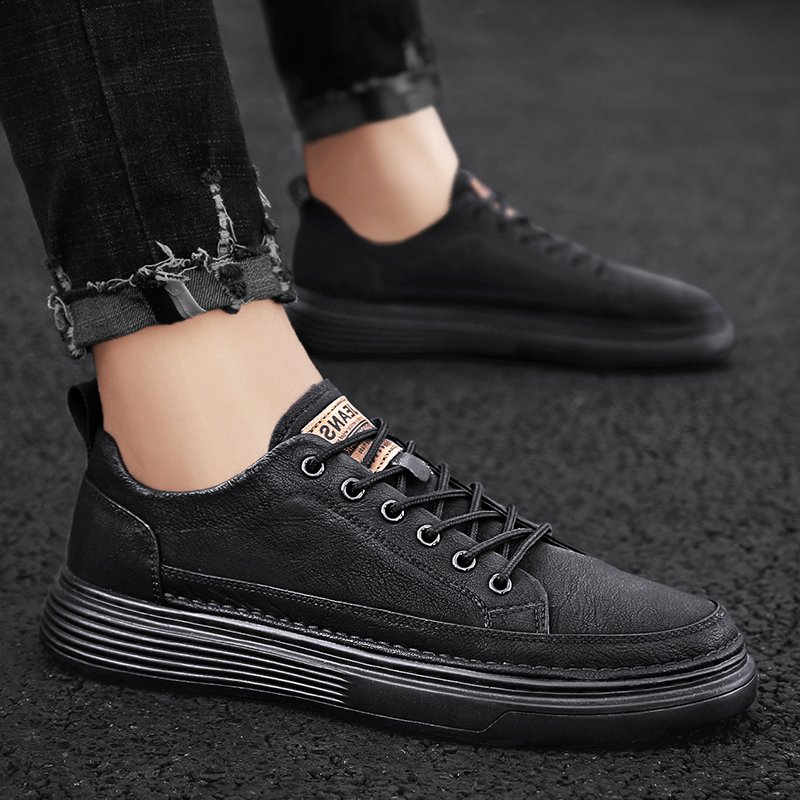 These all-black leather casual shoes are designed with simplicity and elegance, making them ideal for daily commutes, casual wear, or semi-formal occasions. The upper is crafted from high-quality synthetic leather, offering a refined texture and durability. The low-cut design ensures easy wearability and enhances overall comfort. The lightweight, high-elastic sole provides excellent cushioning and grip, making every step stable and effortless.