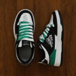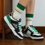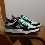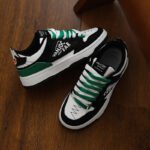 This trendy and stylish sneaker features a unique color-blocking design, with black and white as the main tones accented by striking green details, creating a distinctive and eye-catching look. The upper is made of high-quality synthetic materials, offering both breathability and durability to ensure all-day comfort. The thickened sole provides excellent cushioning and enhanced support, making it perfect for everyday wear or light exercise. The side of the shoe features personalized logo designs and textured details, adding a touch of street fashion. Whether paired with casual or athletic wear, these sneakers will make you stand out in the crowd!