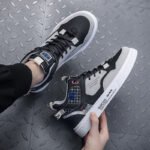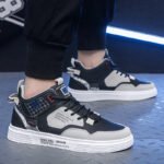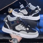 These trendy high-top sports casual sneakers feature a black and grey color scheme with modern lettering and geometric patterns, perfectly showcasing a sleek, urban style. The premium synthetic leather upper is durable, easy to clean, and designed for everyday wear. The soft, breathable lining and cushioned insoles ensure maximum comfort, even during extended walks or activities. The anti-slip rubber sole delivers excellent traction and durability, providing stability with every step. Branding and 3D detailing on the sides add a bold and fashionable touch, making these sneakers a must-have for trendsetters.