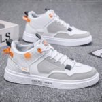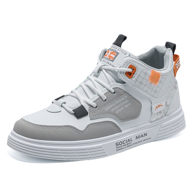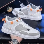 These high-top casual sneakers feature a white and grey color scheme with eye-catching orange accents, blending modern style with unique personality. The sleek design, combined with high-quality synthetic leather and multi-layer detailing, creates a bold and contemporary look. The soft, breathable lining and cushioned insole ensure long-lasting comfort, while the anti-slip rubber sole offers excellent grip and durability, making these shoes perfect for various occasions.