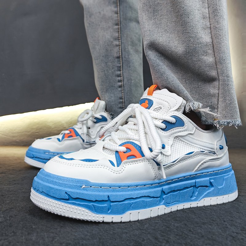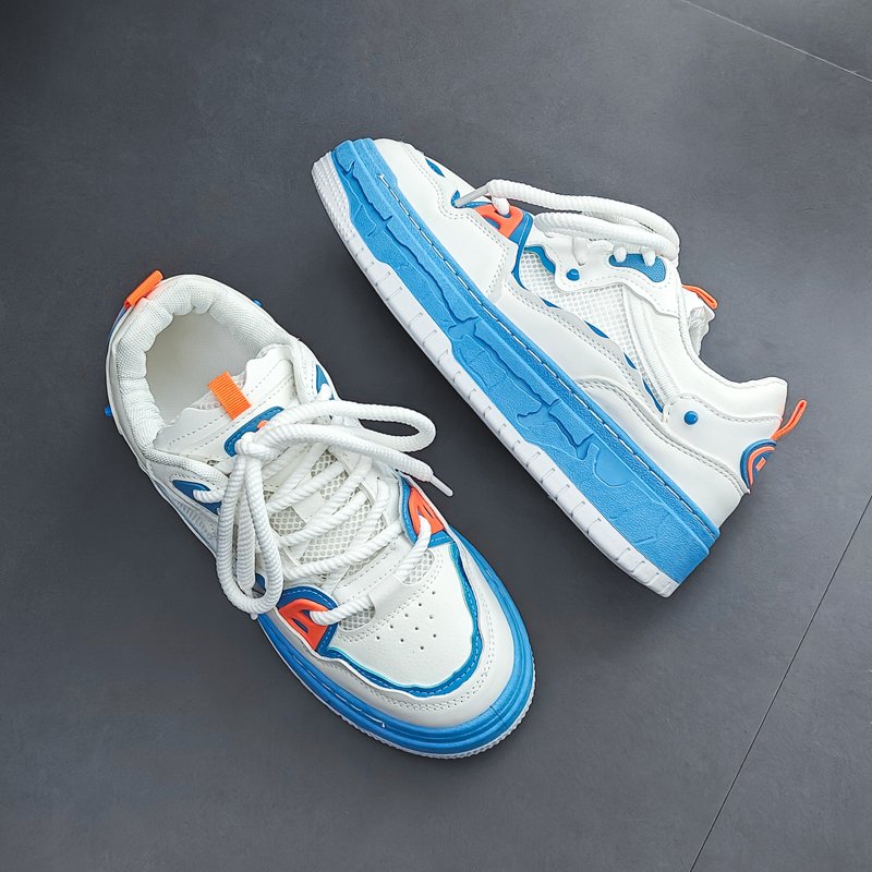 These stylish casual sneakers feature a unique blue and white color combination with eye-catching orange accents, exuding a youthful and trendy vibe. The upper is crafted from premium breathable mesh and durable materials, ensuring long-lasting comfort and ventilation for extended wear. The thick elevated blue outsole not only enhances the fashion appeal but also delivers superior cushioning for stable and comfortable steps. The simple lace-up design makes them easy to put on and take off, effortlessly complementing streetwear, casual, or sporty styles.