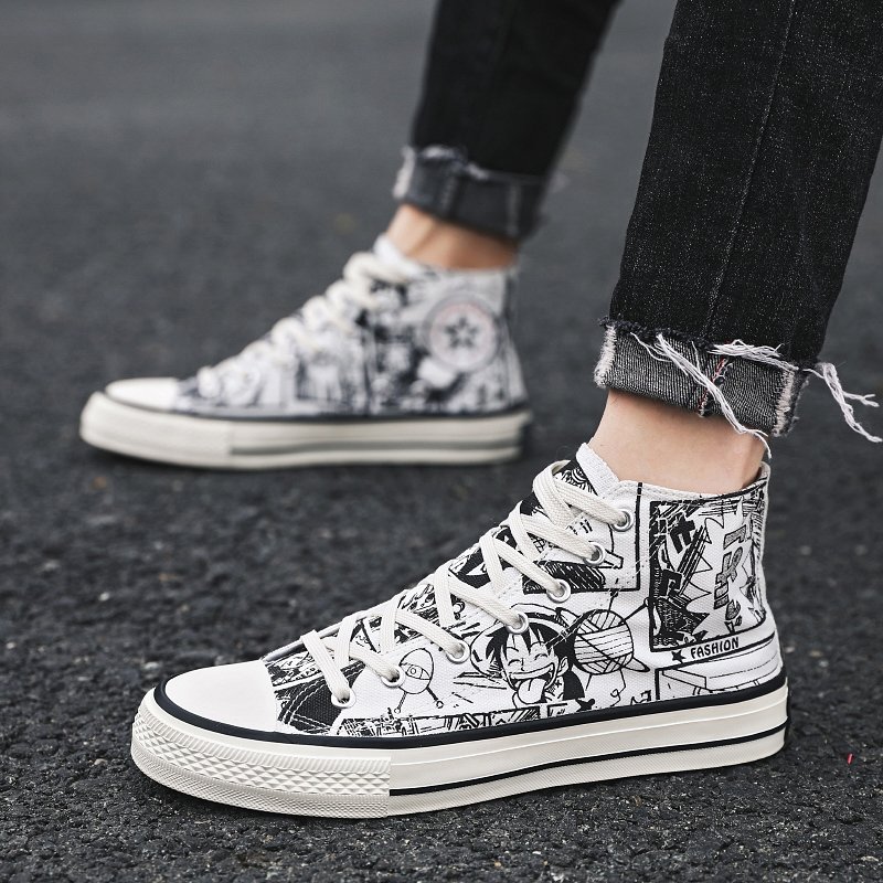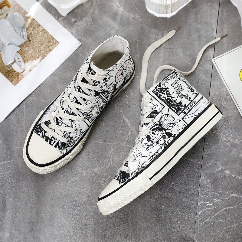 These high-top canvas shoes feature a unique black-and-white anime pattern design, full of creativity and personality, perfectly showcasing the bold fashion attitude of young people. The upper is made of high-quality canvas material, which is breathable and durable, paired with a soft and comfortable insole for an all-day cozy wearing experience. The classic high-top style not only flatters the leg shape but also adds a distinctive trendy element to your outfit. Whether it’s street style, casual wear, or daily outings, these shoes are easy to pair with. More than just a pair of shoes, they are a combination of individuality and art. A must-have for anime and fashion enthusiasts!
