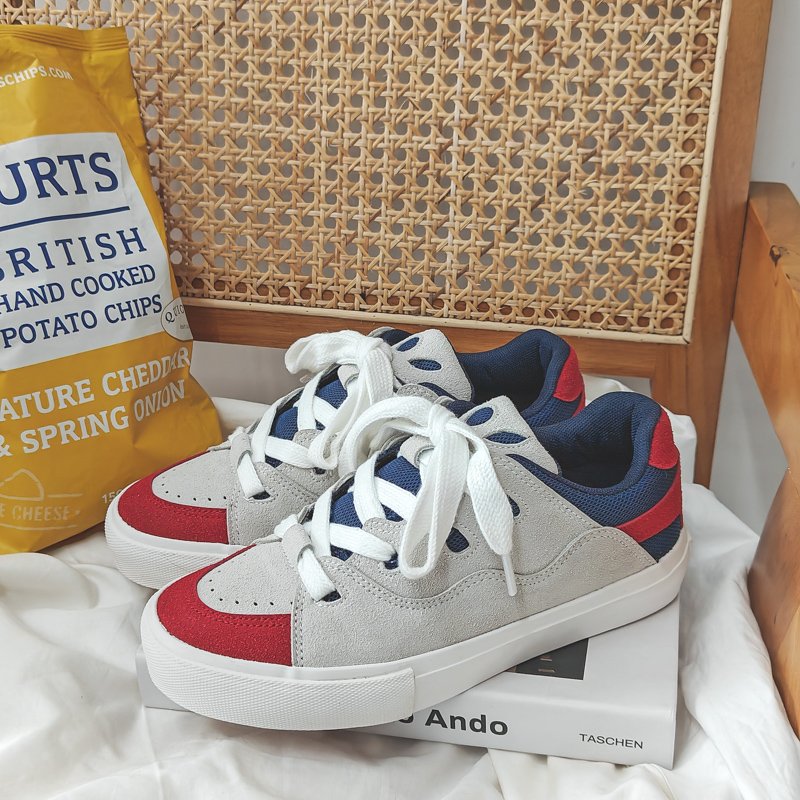 - Design: Red, white, and blue color-blocking with wide shoelaces for a modern and stylish look